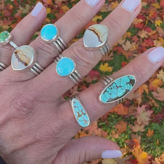 Forged with intention and purpose, the Ridge Ring is the signature design of the Summit Collection, balancing bold lines with the uniqueness of one-of-a-kind stones. Its triple half-round band reflects the natural curves and strength of mountain ridgelines, capturing both elegance and endurance in its form. Each ring is hand-forged in sterling silver and set with a one-of-a-kind stone, a timeless symbol of individuality, strength, and adventure.