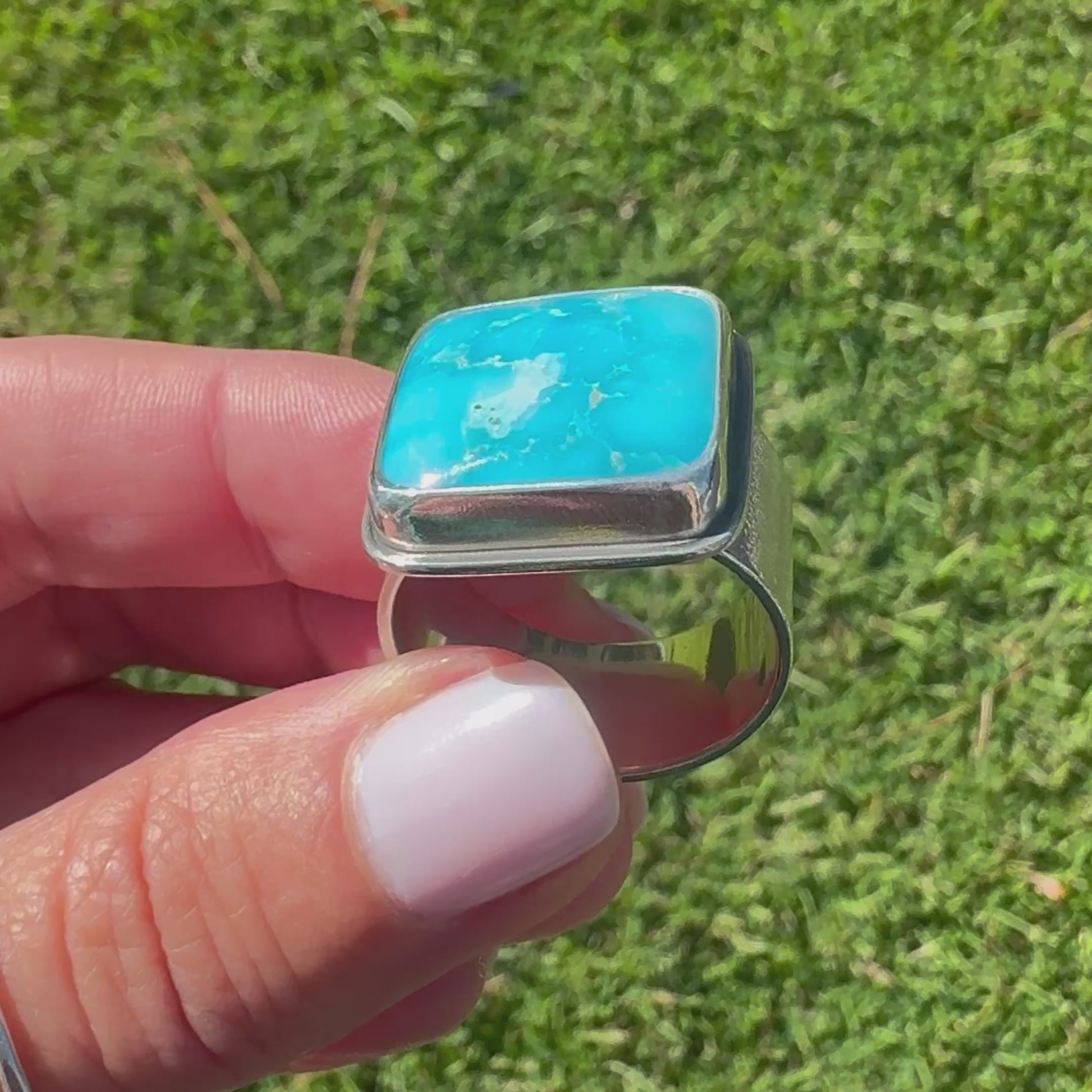 Hand-forged in sterling silver, the Atlas Ring embodies strength and enduring presence. A Kingman Turquoise cabochon sits at its center, framed by minimal hand-textured detailing along the sides of a solid cigar band. While the design remains the same, each Atlas Ring features a one-of-a-kind stone, making every piece uniquely its own. Crafted to ground and empower, it stands as a symbol of balance and adventure — a steadfast companion for every journey.